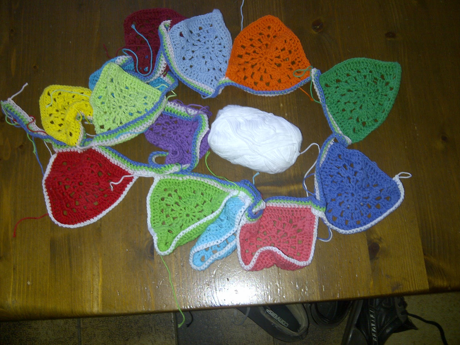 En aangezien ik geen patroon kon vinden wat helemaal naar mijn zin was ben ik zelf maar wat gaan freubelen met deze vlaggetjes als resultaat. Ik heb het patroontje voor mezelf uit geschreven maar mocht er iemand interese hebben dan wil het wel netjes uitschrijvenen op mijn blog zetten.